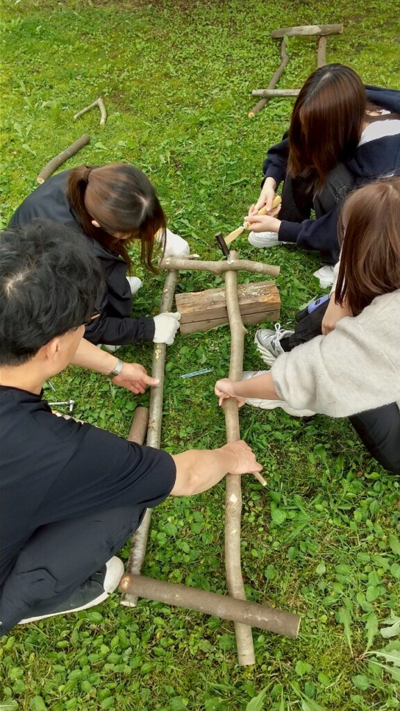 当日は、少年自然の家の森を散策しながら、ノコギリを使って密集した木を伐る「間伐(除伐)」を体験しました。その後、枝や葉を切り落とし、使いやすい長さに整えた木材を使って、ベンチづくりにも取り組みました。