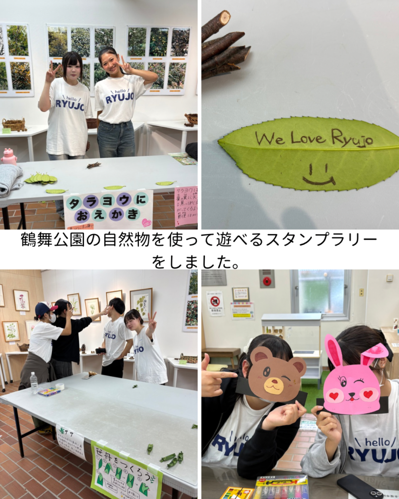 スタンプラリーをしながら、公園内を散策し、それぞれの場所で自然物を使った体験をしてもらいました。